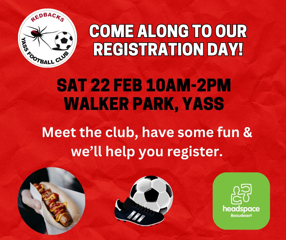 Walker Park, YassCome and join Yass FC for the 2025 winter season! Walker Park, Yass Saturday, 22 February 10:00 AM – 2:00 PM Meet the club, enjoy a sausage sizzle, and check out fun activities for all ages with Headspace Yass while we help you register! We’ll also have the merchandise shop open so you can prepare ahead of the season. This includes our second-hand soccer boot drive.